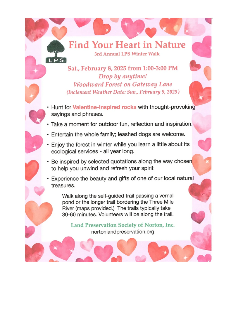 Join the Friends of the WWII Veterans Memorial Trail and the Land Preservation Society of Norton for fall activities and apple cider to celebrate the season! Get information about both organizations and the work they do for our local spaces.